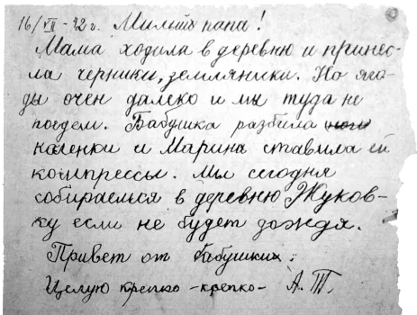 "Милый папа! У нас всё хорошо. В среду мы с мамой пойдем за 30 км. за ягодами. Там растет малина, черника и гонобобель. Это сосновый бор за Унжой. Там водятся медведи, лоси и змеи. Мама туда ходила 2 раза и принесла много черники. Мы сами много съели и немного продали. Первый раз мы продали на 138 руб., а второй на 82 рубля по 7 руб. за стакан... Мы все 3 ходим босиком - из туфель, которые ты мне купил, я вырос... Мама хочет мне покупать шерсть для валенок, для этого нам надо набрать много ягод..."