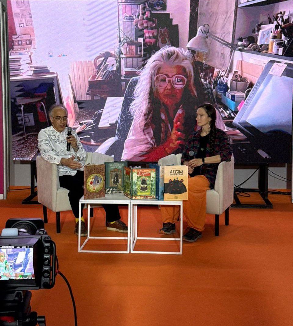 Такая же большая работа была проделана над книгой итальянской художницы Даниэлы Парески "Диковинные животные". Даниэла рассказала по видеосвязи из Генуи, что предложила в ней свою "классификацию видов" - самые мохнатые, самые зубастые, бросающие вызов земному притяжению и т.д. Она изумительно отрисовала их, а российский писатель-зоолог Станислав Востоков тщательно проверил корректность содержащихся в книге сведений, кропотливо переведенных присутствовавшей на встрече Верой Федорук.
