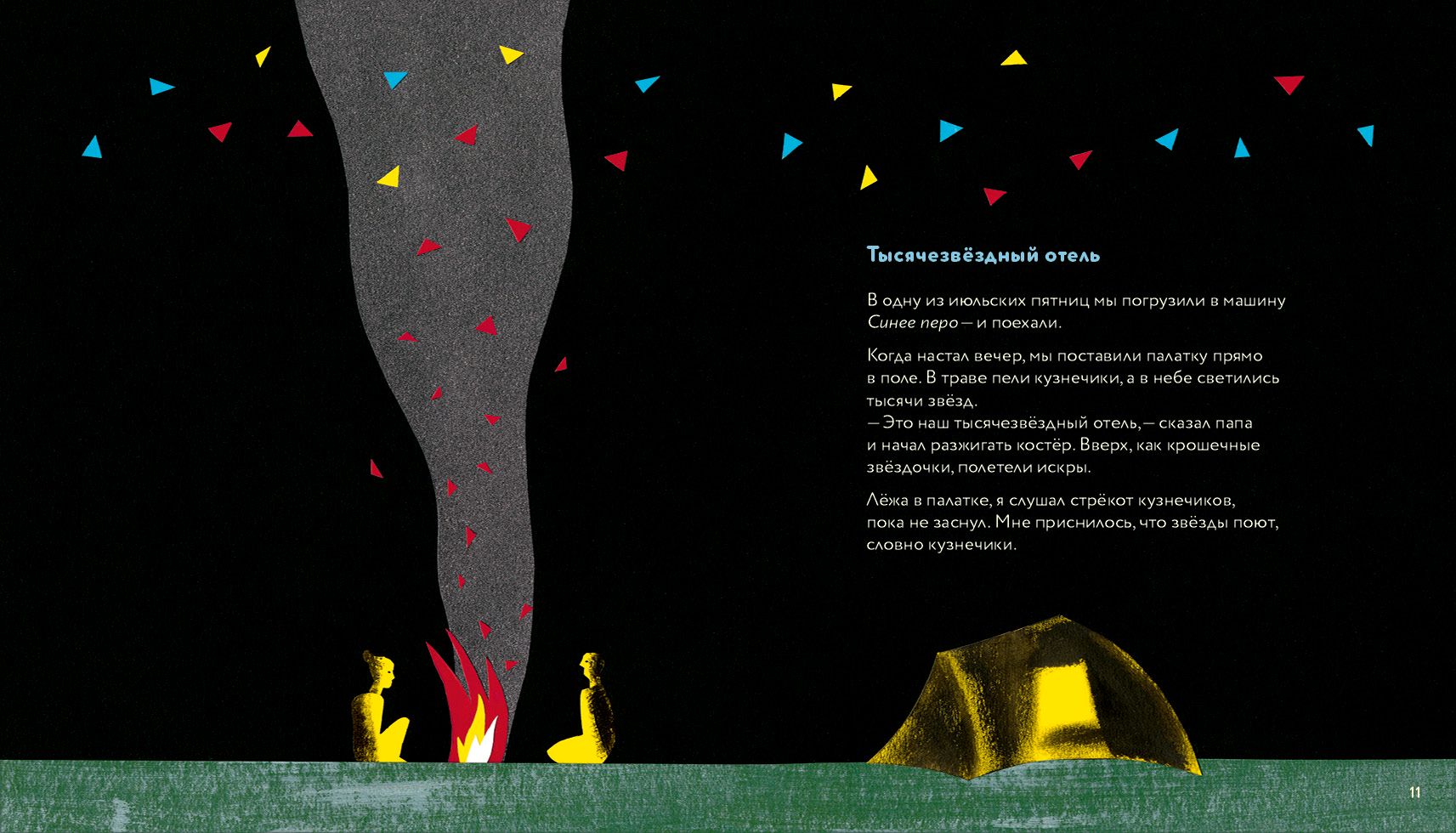 А для иллюстрирования «Синего пера» это не подошло. Карелия поразила нас необыкновенным набором фактур. Гранитные скалы, покрытые лишайниками, изменяющаяся поверхность воды, узоры мхов, сосновые иголки под ногами... Поэтому в качестве техники иллюстрирования своих рассказов я выбрала коллаж. Карелия захотела вот этой ручной "настоящести", если так можно выразиться. Именно образы, найденные в походе, её просили. Я ищу и ловлю в путешествиях звонкое, меткое, выразительное, как Паганель ловил в свой сачок бабочек и кузнечиков. Например, сидишь у костра, первая ночёвка в походе, искры летят вверх, над тобой звёздное небо. Ты по-взрослому думаешь, что можно было бы остановиться в мотеле по дороге в Питер, чтобы сэкономить время. И вдруг приходит образ: тысячезвёздный отель и поющие, как кузнечики, звёзды. И сразу хочется сделать коллаж, на котором летящие вверх искры костра превращаются в звёзды: поддержать словесный образ изобразительным.
