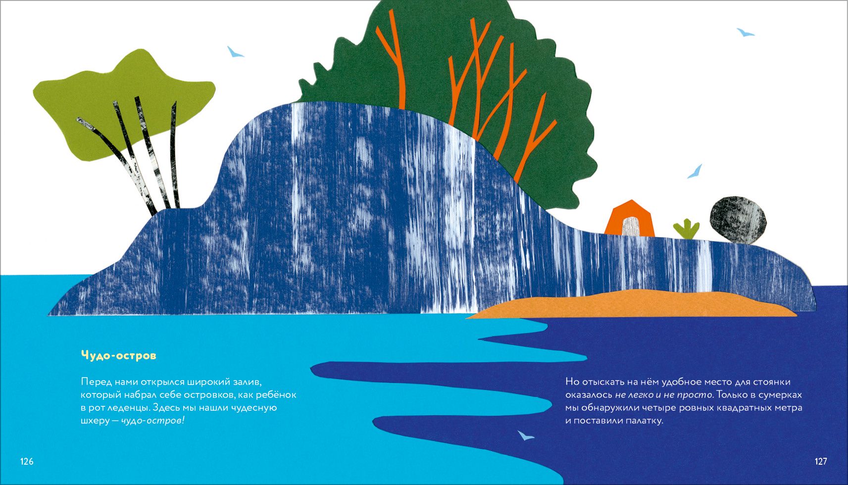 Семейное приключение» она – вместе с явным соавтором, мужем Филиппом и еще тремя скрытыми «соавторами», детьми и собакой, рассказывает о своем карельском путешествии на байдарке. И эта, казалось бы, не интересная никому за пределами дружеского круга семейная история захватывает, как книги Жюля Верна. Не в последнюю очередь – благодаря необыкновенным иллюстрациям в редкой для детской книги коллажной технике.