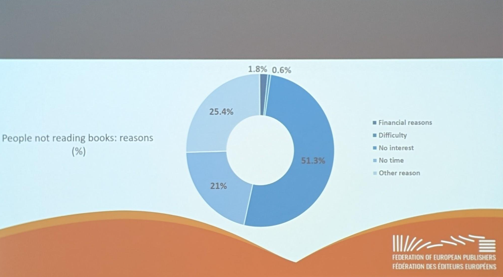 В день открытия ярмарки Федерация европейских издателей (Federation of European Publishers), объединяющая более 6000 издательств и представляющая 80% книжного рынка Европы, поделилась важными данными о состоянии отрасли. Информацию передает пресс-служба детского издательства «Пешком в историю», принимающего участие в ярмарке.
