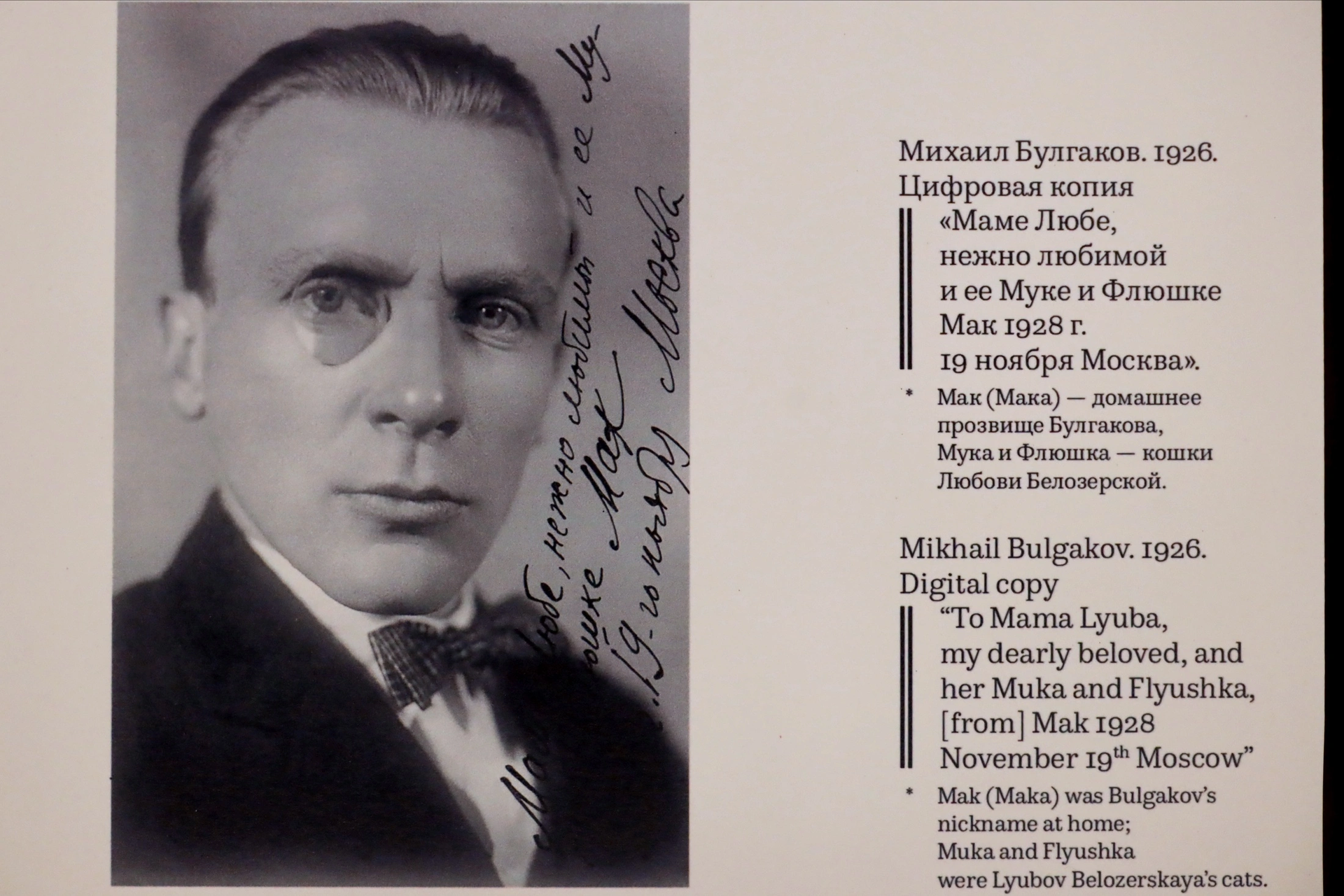 Как она и обещала умирающему мужу. Явно незадолго до их разговора был сделан снимок – маленький, нечеткий, но сегодня бесценный, показанный впервые на этой выставке: Булгаков в постели, уже не способный поднять голову с подушки, рядом жена. Не позволившая забыть имя любимого мужа.
