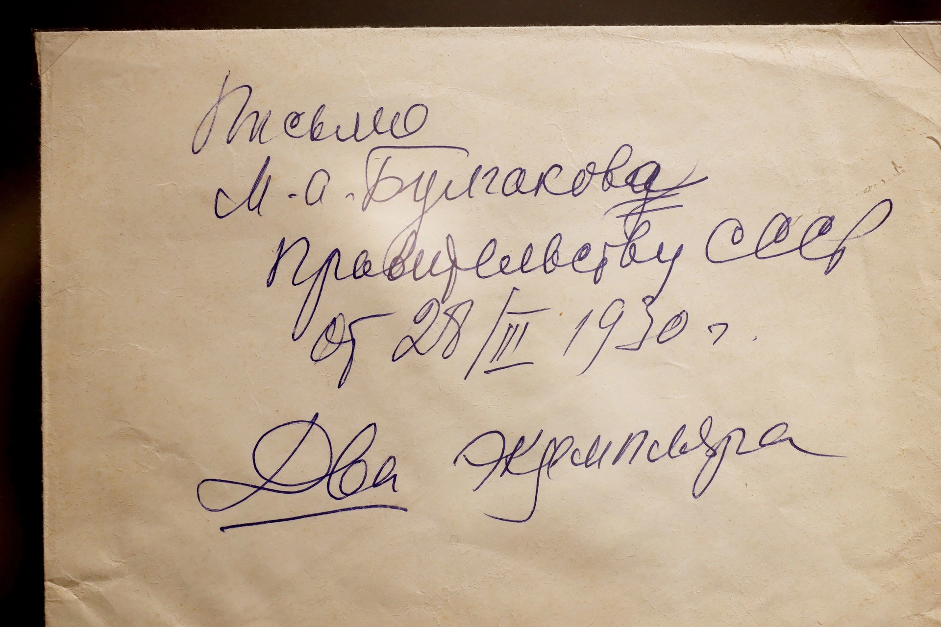 Историю Булгаковых сохранил для нас дневник ЕС, подписи под фото, направляющие зрителей в нужную сторону, взяты, через одну, из него. Пожар в квартире на Пироговке случился, по свидетельству супруги, в тот момент, когда Булгаков в «Мастере и Маргарите» диктовал сцену про пожар в ресторане «Грибоедов». Под рукописью помета от 23 января 1934: «Он (...) в одной рубахе примчался и застал уже кухню в огне».