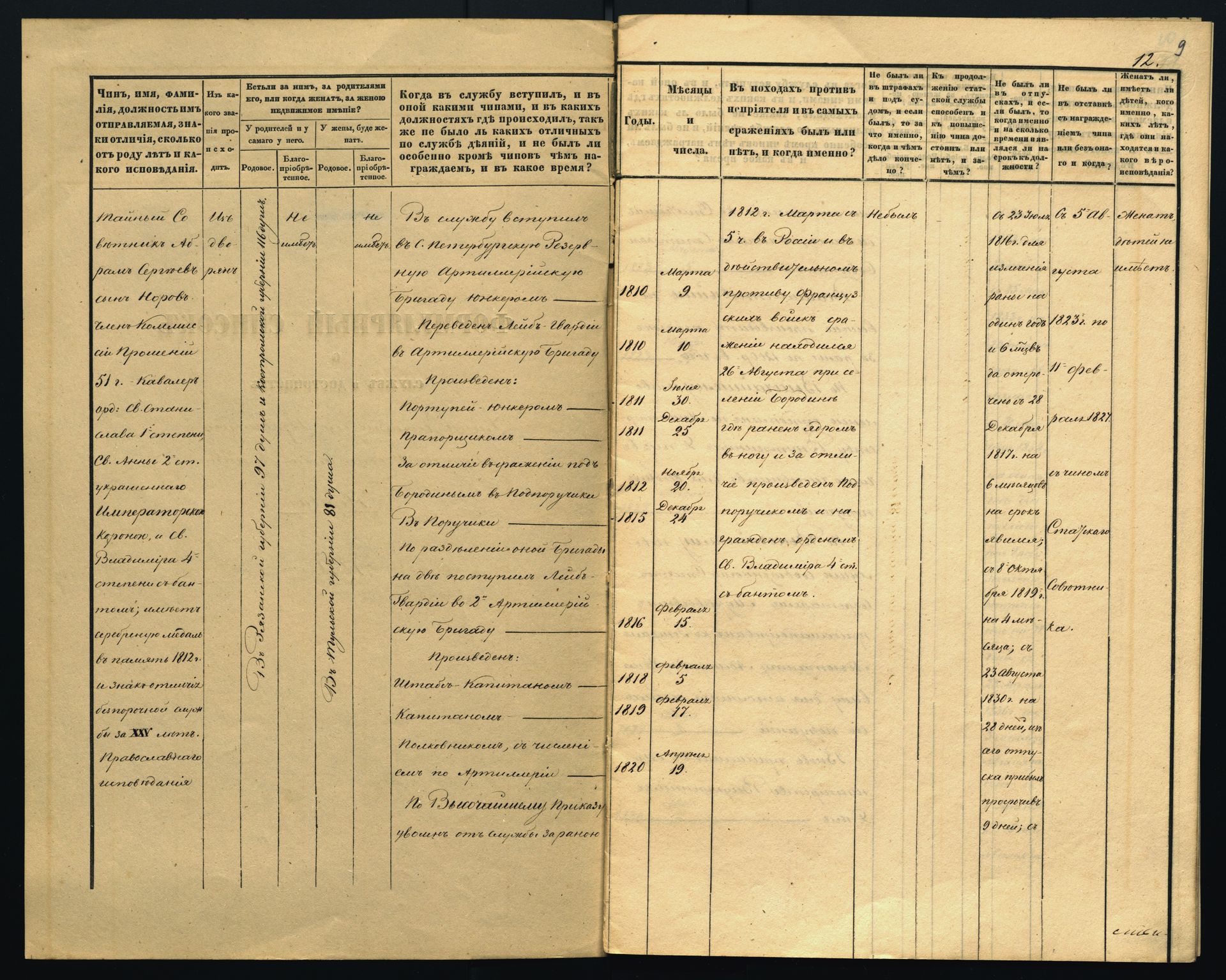 Пятнадцати лет юноша начал службу в лейб-гвардии Конной артиллерии, а через два года участвовал в Бородинской битве. Тогда, проявив исключительное мужество, он получил тяжёлое ранение, которое привело к ампутации: левую ногу отняли почти наполовину, и впоследствии Норов никогда не маскировал одеждой это увечье, считая его, скорее, доблестью и заслугой. Тяжелые события не сломили дух молодого человека и подтолкнули к саморазвитию: продолжая оставаться на военной службе, он почти два года путешествовал по Германии, Франции, Италии и Сицилии (вероятно, и с осведомительными целями), создав за это время несколько ценных корреспонденций, опубликованных в русских журналах и вышедших вскоре отдельными книгами. Полностью военную службу А.С. Норов оставил лишь в 1823 году, выйдя в отставку в чине полковника.