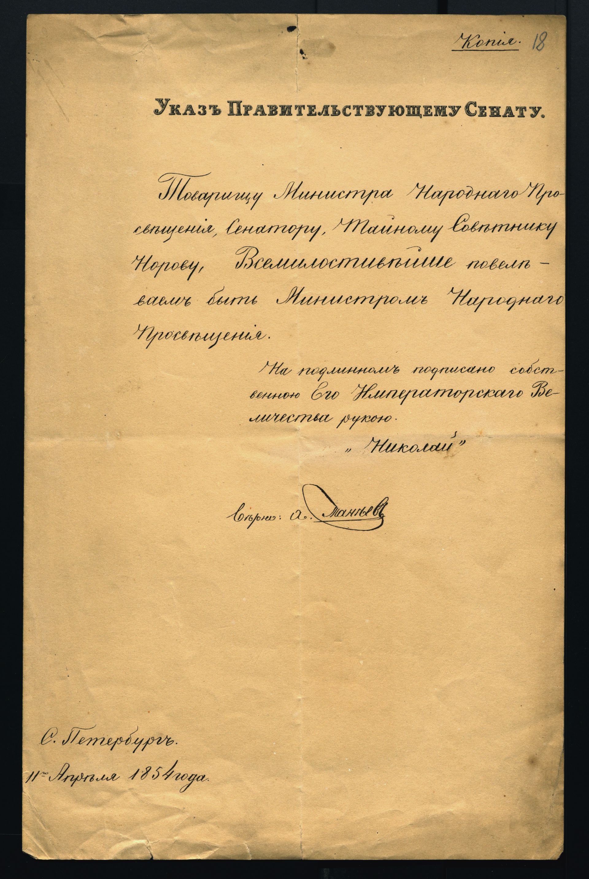 Министерская деятельность Норова отражена в копиях и подлинниках официальных документов: докладных записках о состоянии женских учебных заведений, донесениях о состоянии образования в Польше, а также в деловой переписке с видными деятелями эпохи — Горчаковым М.Д., Уваровым А.С., Сухониным П.П., Танеевым С.А. и другими.