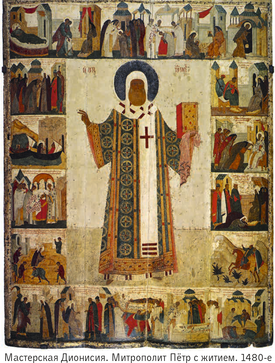 Иконы появляются на Руси вместе с первыми христианами. Написанные на Руси иконы известны с X века. Нас в контексте исследования интересует только один тип икон — житийные. Они пришли на Русь из Византии вместе с православием и получили широкое распространение. В центре (среднике) такой иконы находится изображение святого, а в небольших секциях по краям (клеймах) запечатлены ключевые сцены из его жизни. Сюжеты посвящены, в первую очередь, пути героя как святого. В житийную икону попадали также элементы одежды и архитектуры, современные иконописцам.В клеймах могли отображаться и сцены, важные с политической точки зрения. Так, Пётр, митрополит Киевский и всея Руси с 1308 по 1326 год, в междоусобной борьбе русских князей поддерживал Москву.