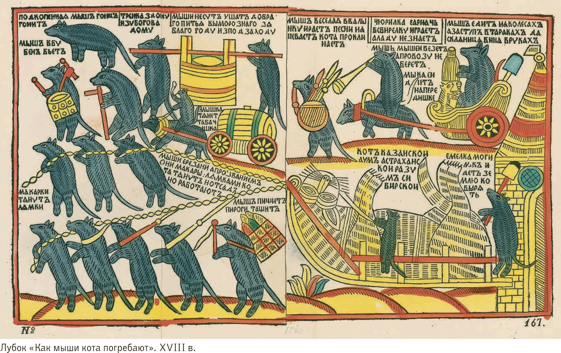 Почему же именно эта история настолько засела в массовом сознании, что даже получила трансмедийные расширения? («Майор Гром», оказывается, не был первым.) Стоит приглядеться к титулу центрального персонажа. «Кот казанский, ум астраханский, разум сибирский» явно отсылает к царским титулам. Так, полное величание и Петра I, и его отца Алексея Михайловича включало в себя «Царь Казанский, Царь Астраханский, Царь Сибирский». Также на оттисках второй половины XVIII века указывается, что мыши представляют разные области царства. Это позволило исследователям сделать вывод: на лубке изображены похороны Петра Великого, ведь именно он разработал церемониал для своих похорон, по которому за гробом императора должны были нести гербы различных провинций.