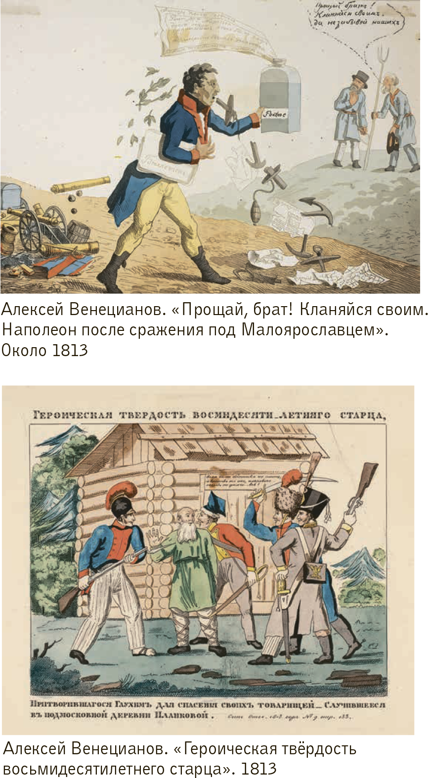 Наиболее известны работы трёх художников в Петербурге— Алексея Венецианова (1780–1847), Ивана Теребенева (1780–1815) и Ивана Иванова (1779–1848). Они высмеивали галломанию российского дворянства, преклонение перед французами и подражание им, а впоследствии стали выпускать листки по следам военных событий. Изображения были выполнены в технике раскрашенного офорта.
