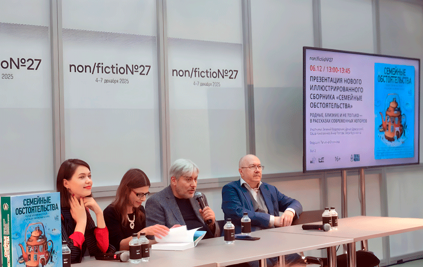 В третий день работы ярмарки non/fictio№27 состоялась презентация сборника рассказов «Семейные обстоятельства» — издания, которое позиционируется как «идеальный подарок на Новый год». Книга вышла в серии «Иллюстрированный бестселлер» и собрала под одной обложкой произведения 17 современных писателей о родных, близких и тех невидимых связях, что делают семью настоящей.