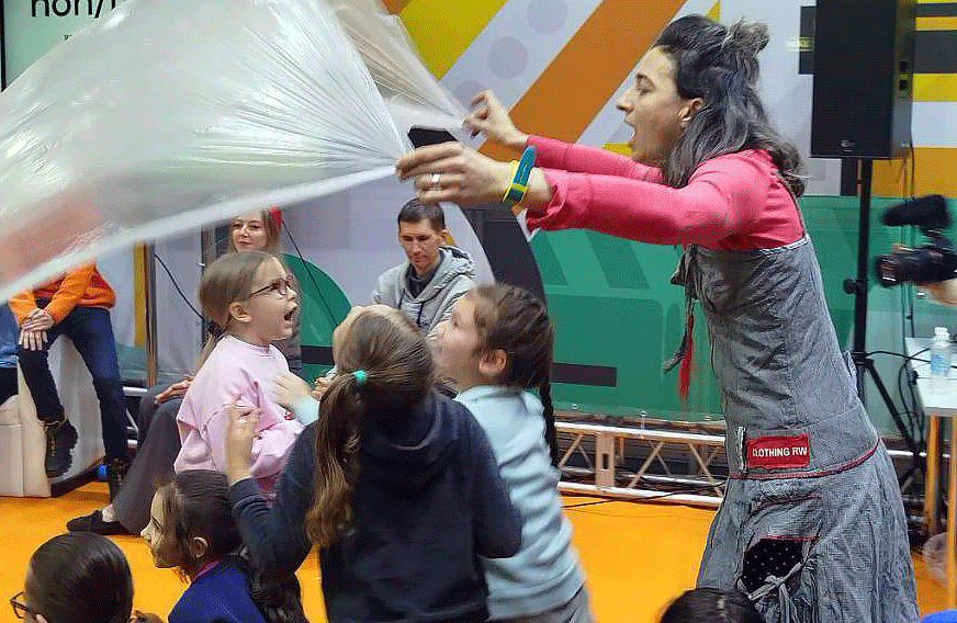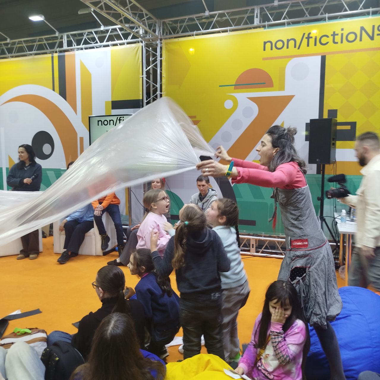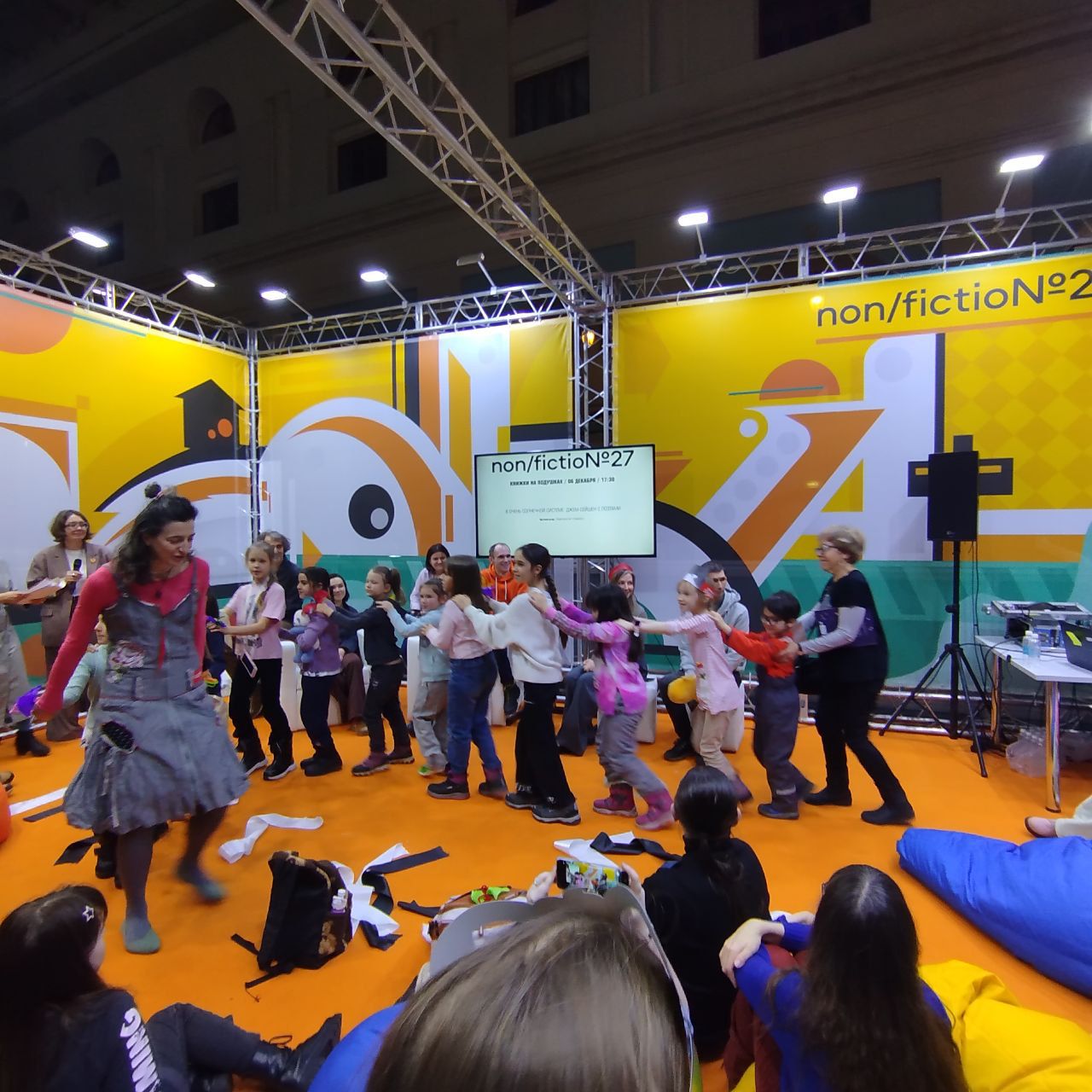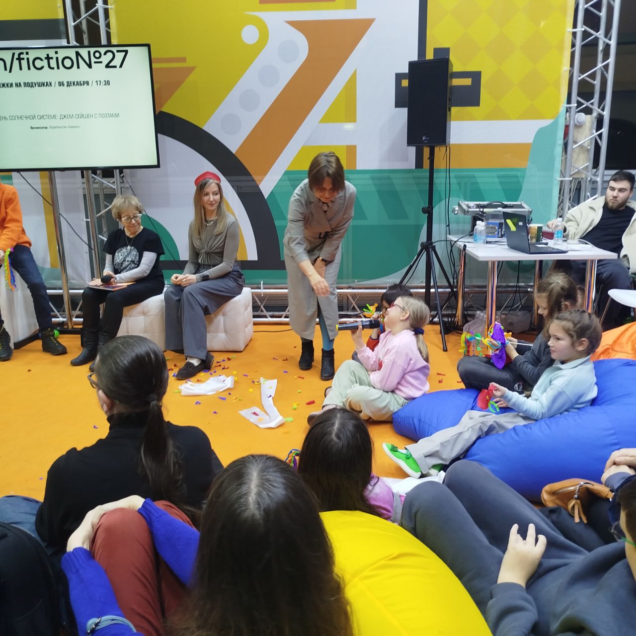 Под руководством летне-балетной Лены дети при помощи нехитрого, но всемогущего реквизита изображали зеброход из стихотворения Алексея Зайцева, чайку из стихотворения Стаса Востокова, питона из стихотворения Германа Лукомникова, ехали поездом за, а потом и вместе с Мариной Бородицкой, перелетали на юг, топали, хлопали и мяукали за пешеходный перекот, а взрослые дяди и тети поэты (на мероприятие смогла прийти примерно половина авторов) читали для них стихи. Взрослым зрителям тоже временами предлагалось подключаться к игре и становиться декорациями — так, автор этой статьи не смог записать часть своих впечатлений, так как во время выступления Анастасии Орловой вынужден был изображать дерево (накануне, на презентации собственный книги, Вера изображала ананас - ред.).