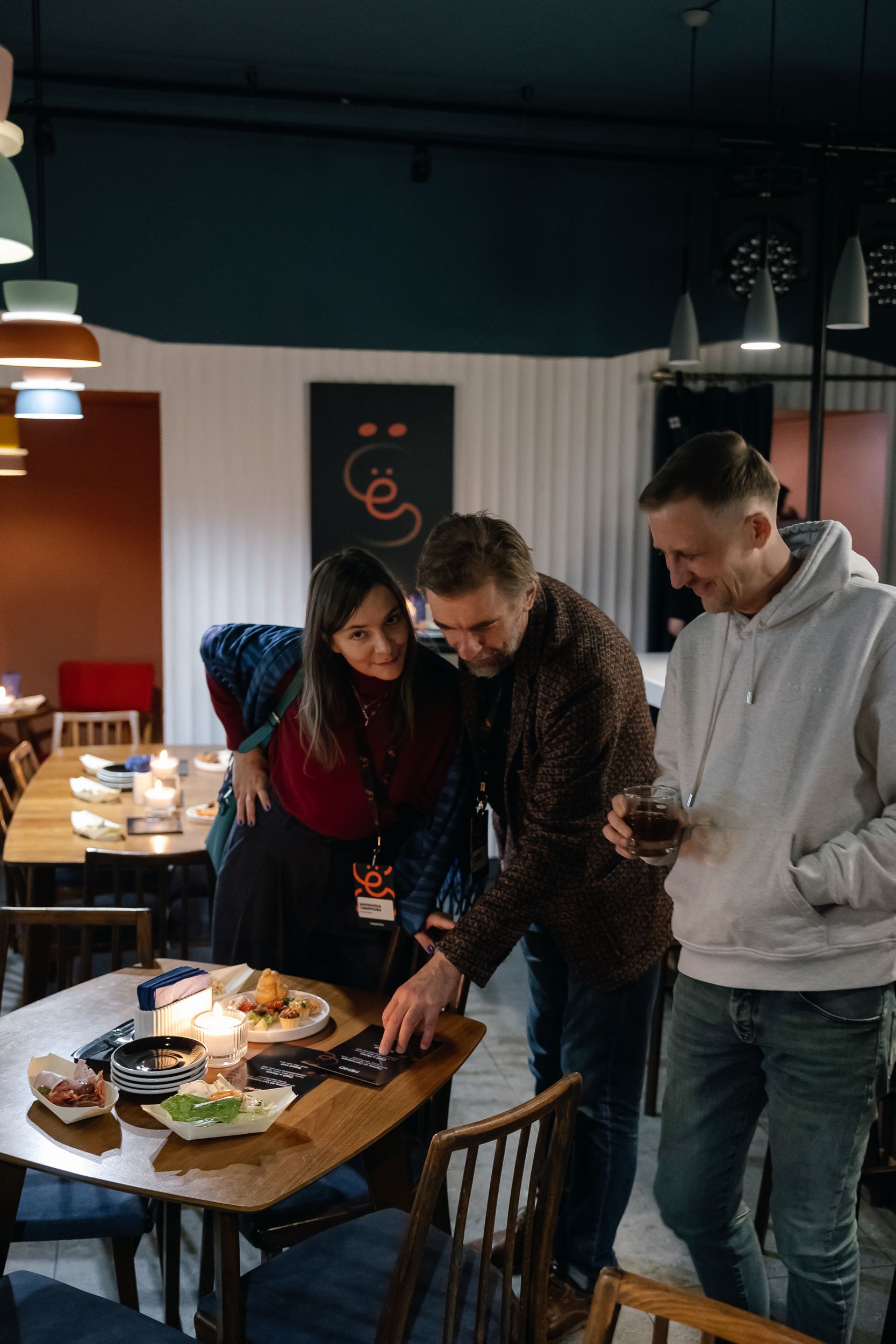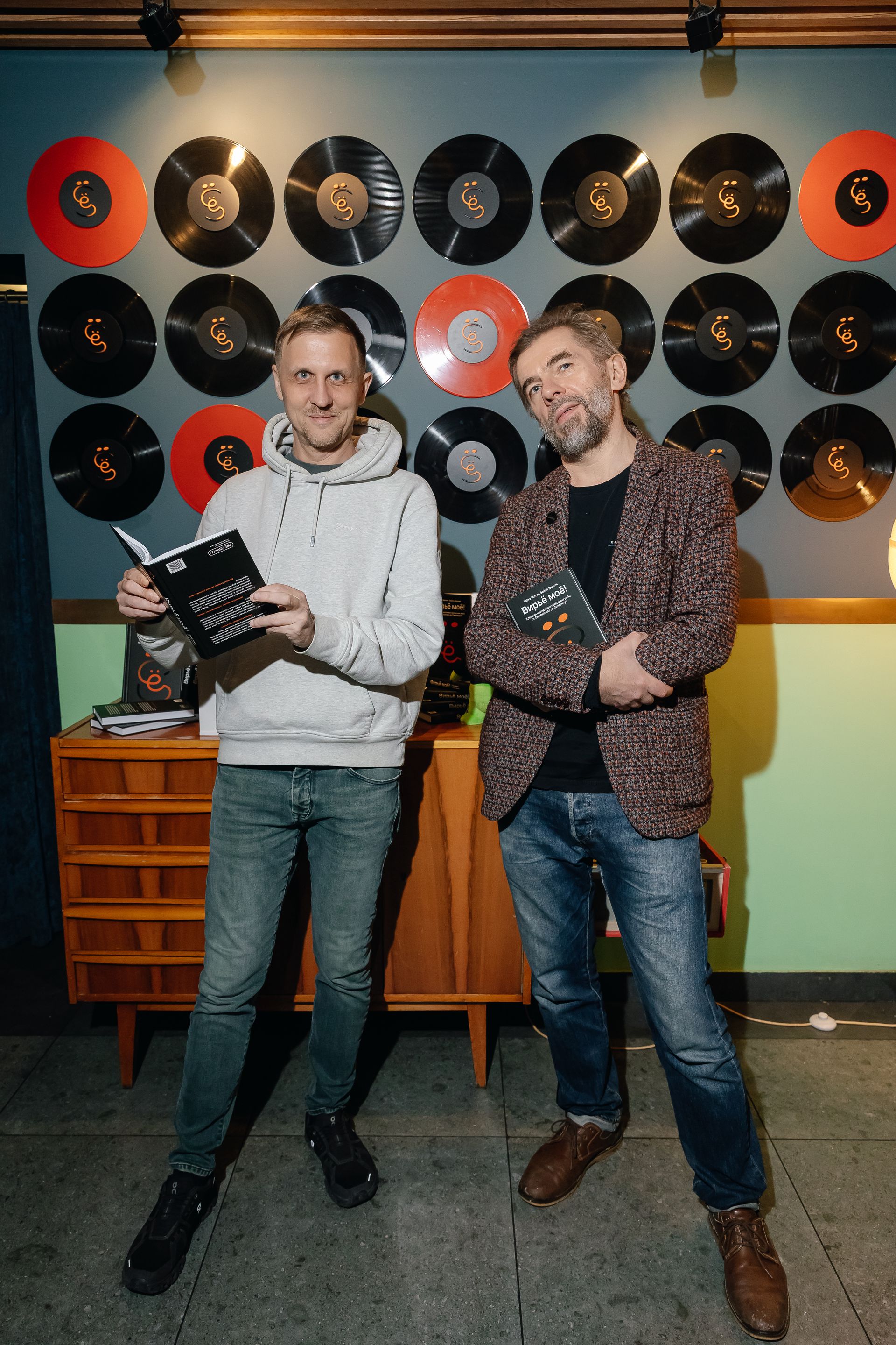 В темном помещении бара гости заказывают фирменные коктейли "со вкусом" героев вечера – например, "Парень из Сыктывкара". На стене за сценой висит плакат со знаком-символом-логотипом с обложки: что это? Поясняют: заказанное у студии Артемия Лебедева изображение двойной буквы "ё" передает свою философию. Выходящая из тени вечности и снова уходящая в нее буква соединяет в себе два написания: строчное и заглавное. Обложка книги повсюду: ее увидишь еще с улицы, а потом замечаешь на стенах, на стеллажах в нишах, на меню барной стойки.