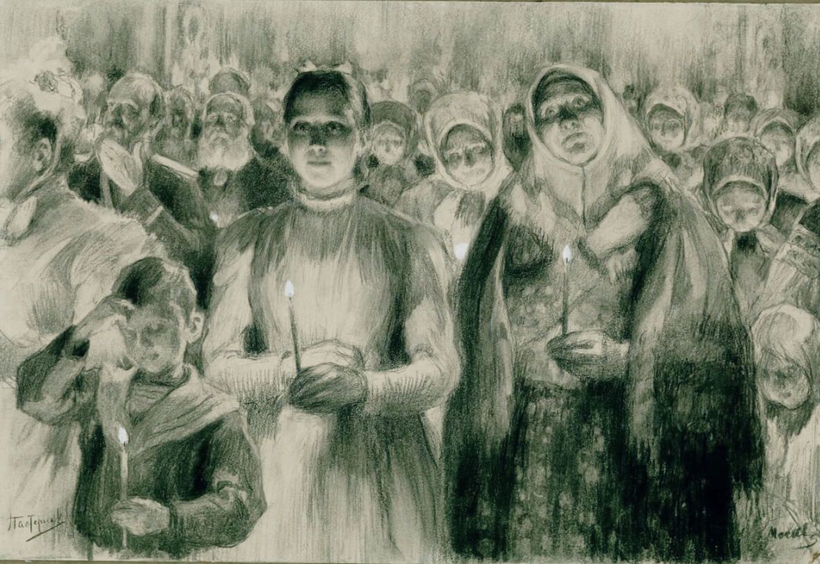 ...Катюша на заутрене со свечкой, в суде, бежит за поездом, увозящем Нехлюдова. Живые, полные нюансов, импрессионистические иллюстрации Леонида Пастернака на выставке словно вводят персонажей романа в реальность, сталкивают смирение с насилием, живое с показным.