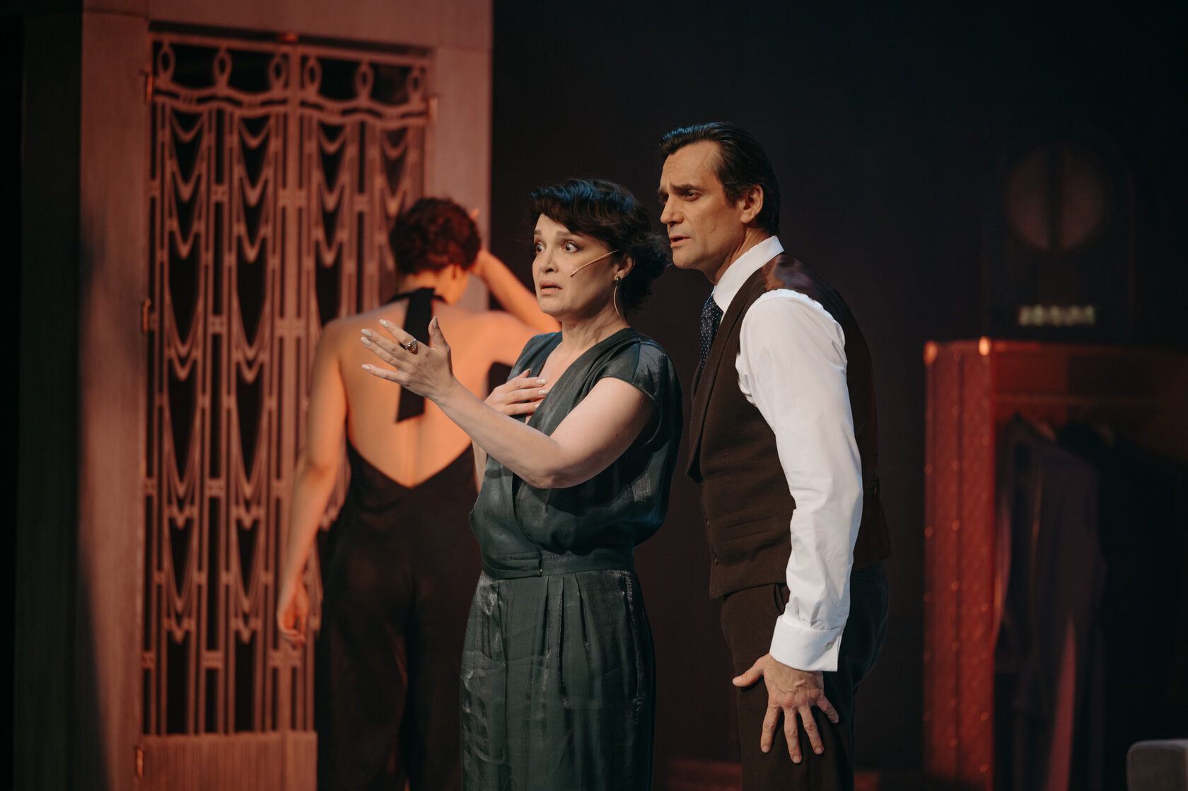 Сюжет мелодраматичный, а сценическое наполнение лаконичное. Софа длиной с лимузин и паникадило-люстра, да и выдвижной прозрачный короб, изображающий ресторан, - весь предметный мир сцены. Режиссёрская ставка на других важных приёмах: игра с освещением и чередование планов. Комбинация такого рода решений помогает монологам Анастасии Светловой менять регистры, что вкупе с выдающейся игрой актрисы даёт богатые эмоциями эпизоды.