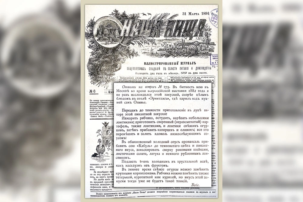 Рецепт того самого салата из ресторана Оливье, который в то время принято было называть закуской, опубликовал журнал "Наша пища" в 1894 году. Это было спустя 11 лет после смерти Люсьена Оливье. Передал нам его кулинарный эксперт издания некто господин Вебе, ведущий рубрики "Вопросы и ответы". "Как приготовляется закуска оливье?" - интересовался читатель. И Вебе отвечает: