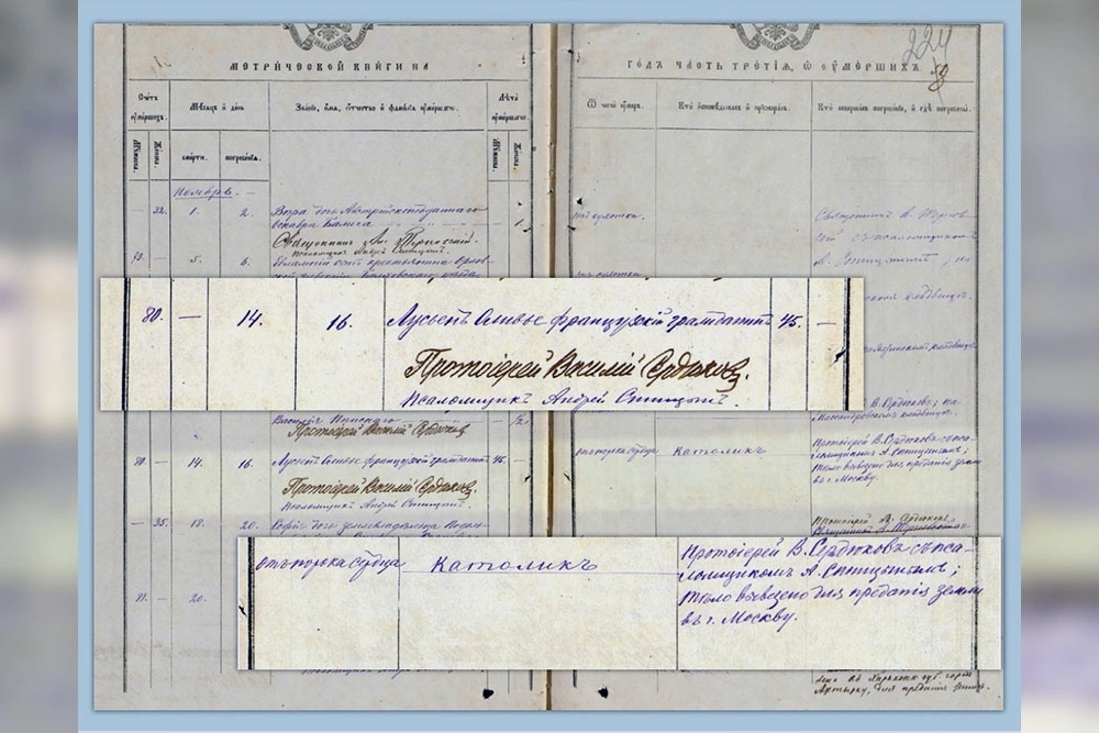 Анна Круглова: Люсьен Оливье умер в Ялте 14 ноября 1883 года. Его смерть засвидетельствовали протоиерей Василий Сердюков и псаломщик Андрей Спицын из храма Святого Иоанна Златоуста. Впервые эту запись обнаружила краевед Анна Сироткина. В книге у меня есть фотография оригинала документа, предоставленная Государственным архивом Республики Крым. Причиной смерти церковные служащие посчитали "порок сердца". В последней графе метрической записи сказано, что "тело вывезено для предания земле в Москву".