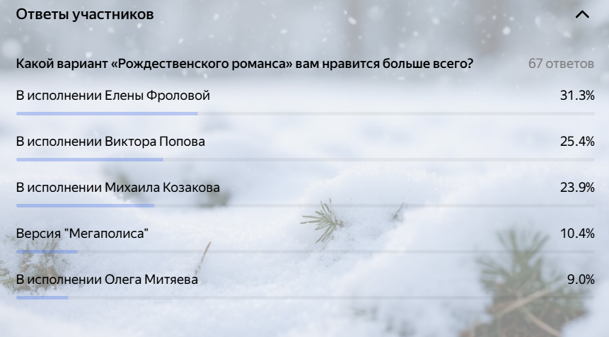 Безусловным лидером стала версия в исполнении Елены Фроловой — ее выбрали 31,3% опрошенных. Нежный, проникновенный вокал певицы, по‑видимому, сумел наиболее точно передать лирическую глубину и меланхоличное настроение текста Бродского, заставив слушателей по‑новому ощутить магию рождественской ночи, описанной поэтом.