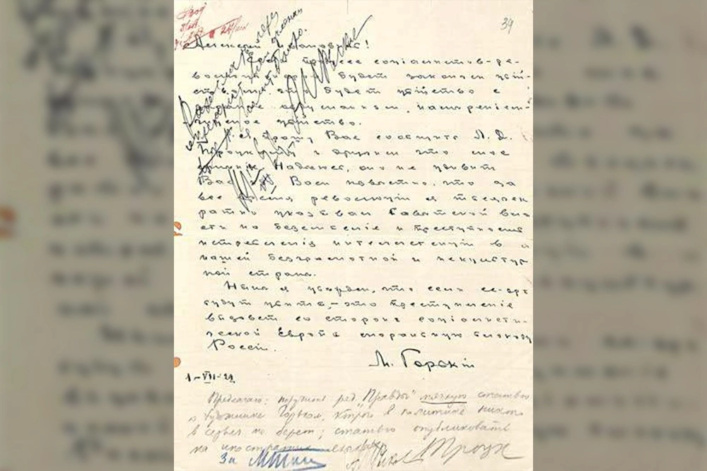 Именно таким почерком, например, написано его письмо из итальянского Сорренто в Москву члену Политбюро ЦК партии ВКП(б) А.И. Рыкову в 20-е годы ХХ века.