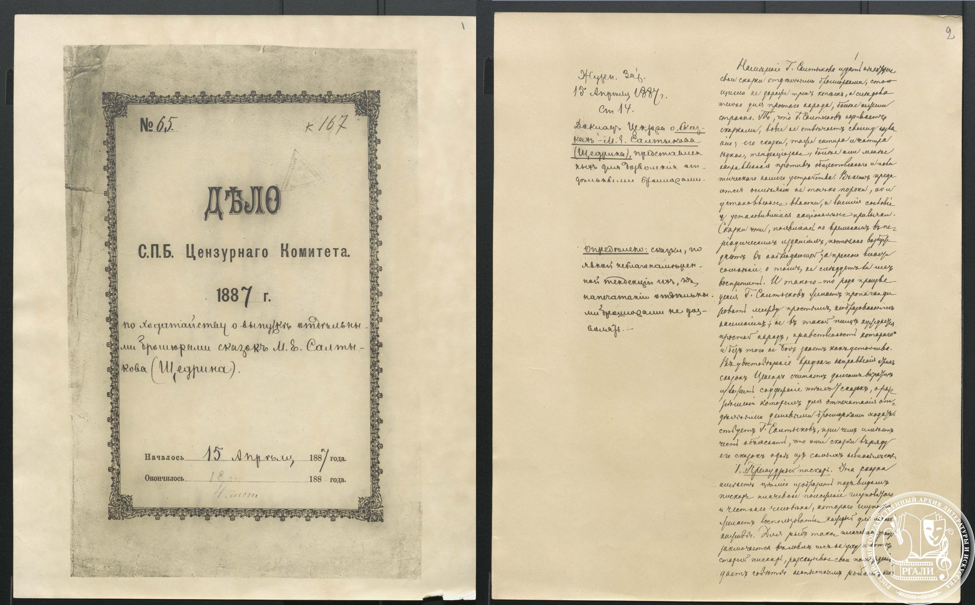 В своем известном цикле сказок писатель использует широкую палитру народных образов и речи, «зоологические» шаржи. В РГАЛИ мы можем найти рукописи многих сказок: «Повесть о том, как один мужик двух генералов прокормил» (1869), «Орел-меценат» (1880–1885), «Богатырь», «Вяленая вобла», «Добродетели и пороки», «Медведь на воеводстве», «Недреманное око», «Обманщик-газетчик и легковерный читатель» и других. Также в фонде хранится журнал заседания Цензурного комитета о запрете печатать сказки Щедрина отдельными брошюрами. Большая часть сказок печаталась в «Отечественных записках», отдельно же они были изданы только в 1887 году.
