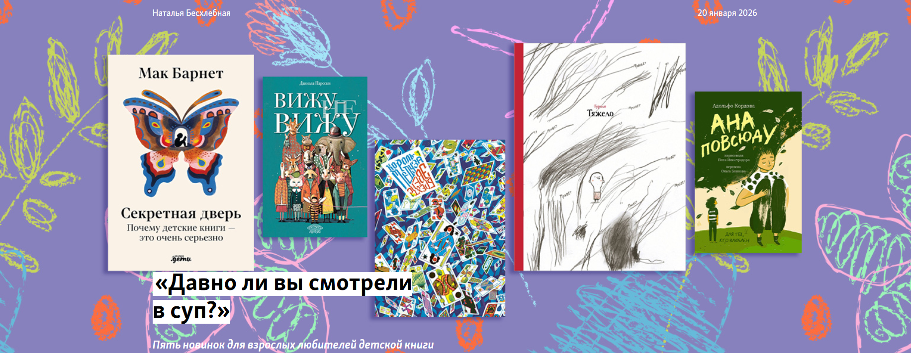 «Горький» обозревает пять новинок для любителей детской книги. Из редакционного предисловия: «Из новинок ушедшего года мы решили отобрать именно те, которые будут интересны взрослым. Это довольно несхожие книги, но все они напоминают о том, каково быть маленьким в огромном мире: что чувствует ребенок, как воспринимает себя и взрослых, как реагирует на радости и кошмары повседневности». О книге Даниэлы Парески в переводе Михаила Визеля: «Даниэла Парески таким образом догоняет сразу двух зайцев: с одной стороны, учит ребенка видеть суть вещей, а с другой — напоминает взрослым о том, как именно смотрят дети. Ведь дети, наделенные не только зверским любопытством, но и ощущением бесконечности времени, не ленятся настраивать взгляд на цельную сущность супа, чтобы увидеть сразу все его составляющие в одном кадре: морковку и лук, готовку и соль». О книге Брехта Эвенса «Король-медуза»: «Беззащитность младенца показана Эвенсом с особой тщательностью, дело не только в крошечных размерах и физической слабости, но и в том, что мир для него — это хаос: многочисленные незнакомые звуки гремят какофонией, формы и цвета тоже превращаются во что-то неразборчивое…»