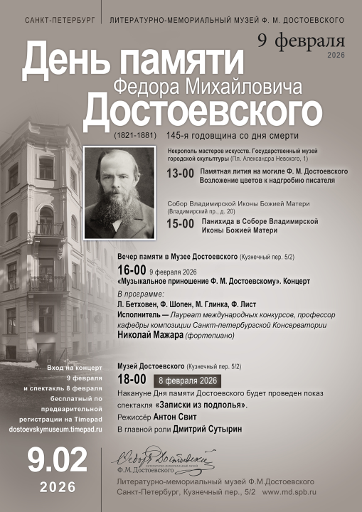 9 февраля 2026 года Музей Достоевского открыт для посетителей с 11:00 до 18:00. Вход в музей — бесплатный. В связи с ограничениями по количеству посетителей посещение музея будет организовано по сеансам каждые 30 минут — с 11:00 до 17:00. Бесплатный билет на сеанс можно получить в кассе музея 9 февраля.