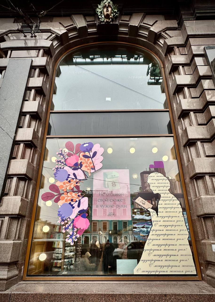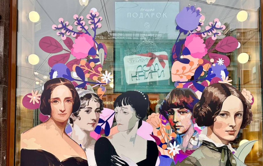 В преддверии Международного женского дня «Дом книги» на Невском проспекте (Санкт-Петербург) украсили портретами писательниц и поэтесс. Об этом сообщается в телеграм-канале «Дома книги».