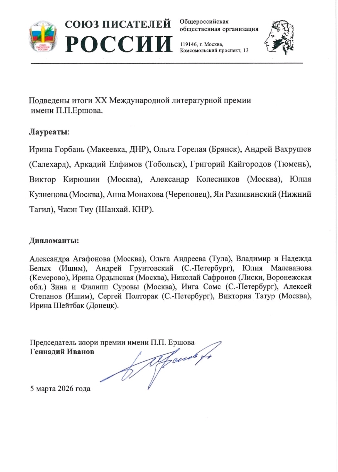 Подведены итоги XX сезона Международной литературной премии имени Петра Ершова, учрежденной с целью поддержки современных авторов, «продолжающих лучшие традиции классической русской литературы для детей и юношества». Имена лауреатов опубликованы в группе Ишимского музейного комплекса им. П.П. Ершова.