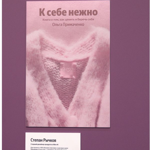 Например, бестселлер Ольги Примаченко «К себе нежно» на галерее проиллюстрирован розовым кардиганом; он же экспонируется рядом. За концепцию отвечал тот же художник, что работал в первой части проекта над халатом «Обломова». Создать столь радикальную образную преемственность решили сразу: ну кто мог подумать, что мотив гениального романа Гончарова будет воспринят при иллюстрировании терапевтического бестселлера по женской психологии «К себе нежно».