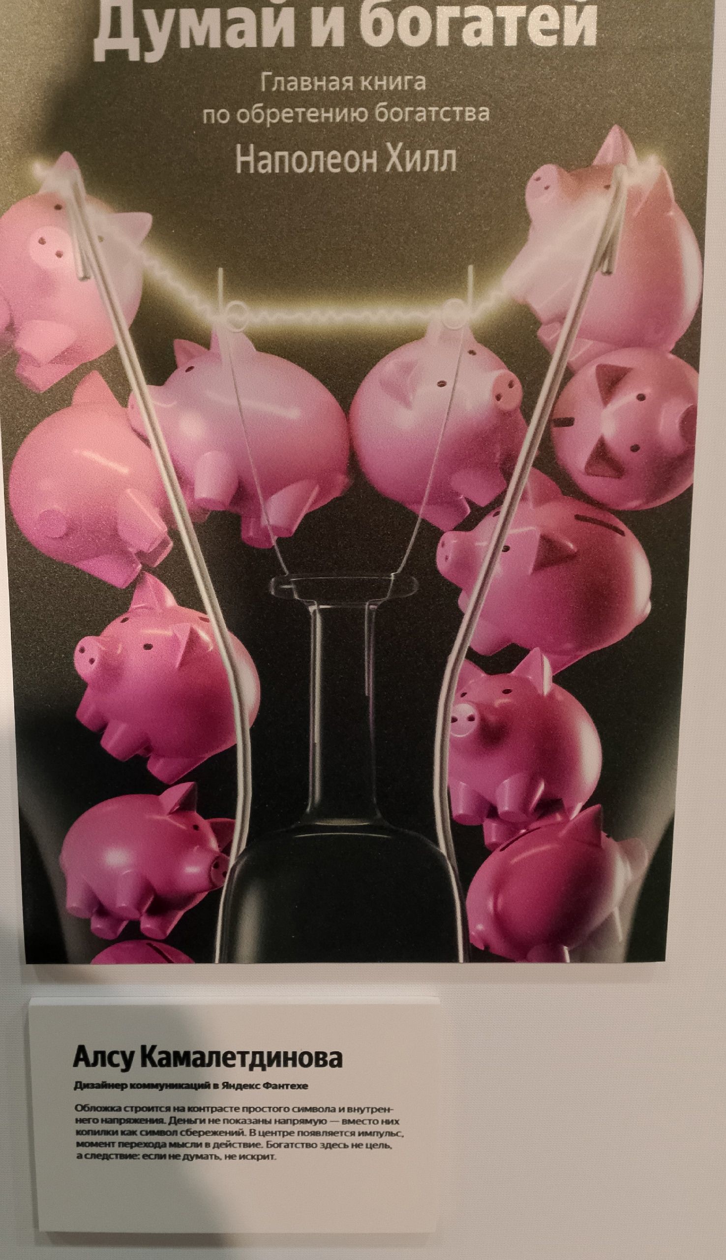 В Бродильном цеху ЦСИ Винзавод Яндекс организовал выставку: книжную? или художественную? – как посмотреть. Перед нами 100 новых обложек к бестселлерам. Миниатюрные принты располагаются вдоль большей части цеха. К каждой обложке прилагается краткий комментарий автора: