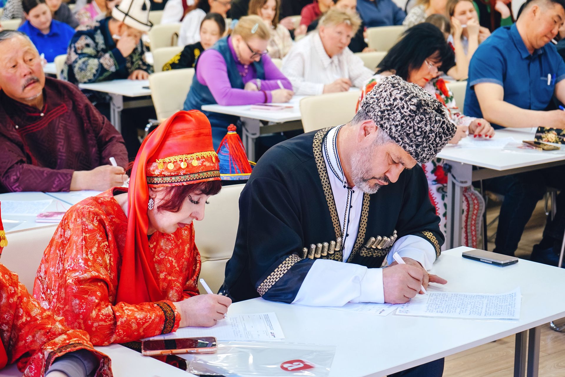 «Гамто!» — приветствует на родном языке входящую в аудиторию группу людей в национальных корякских кухлянках представительница коренных малочисленных народов Севера, представившаяся Любовью. «Гамто!» — зычно отвечают они ей, а далее — радостные объятия и нескончаемый поток новостей о людях из крошечных сёл, раскиданных по просторам камчатской тундры. «Дзень добры!» — говорят друг другу представители белорусского землячества на Камчатке, которые также по случаю общего праздника русского языка пришли написать диктант в национальных белорусских костюмах. «Ассаламу алейкум!» — звучит от мужчин в кавказских папахах, внимательно изучающих бланки для написания текста: кажется, они просто не привыкли ошибаться.