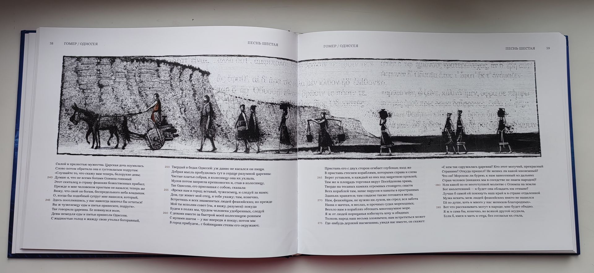 К опубликованному нами фрагменту этого изумительного арт-бука и небольшому интервью с заслуженным и узнаваемым по одному штриху художником, мне остаётся только добавить, что издание снабжено комментариями Сергея Ошерова уточняющими, а порою и полемизирующими с классическим переводом Василия Жуковского. Который, конечно, не учёный античник, а просто один из лучших русских поэтов XIX века – и переводил Гомера, сидючи в Дюссельдорфе, по немецкому подстрочнику, в лучшем случае проговаривая про себя звучные греческие слова, не понимая смысла каждого из них. Но победителей не судят, а Жуковский хоть и признал себя побеждённым учителем по отношению к поэту Пушкину, переводчиком-адаптатором все-таки остался мало кем превзойдённым в русской литературе.